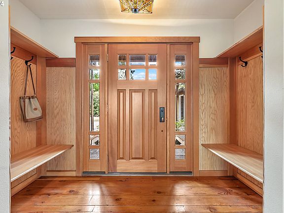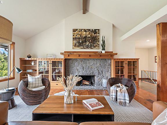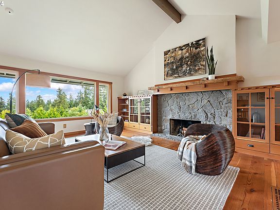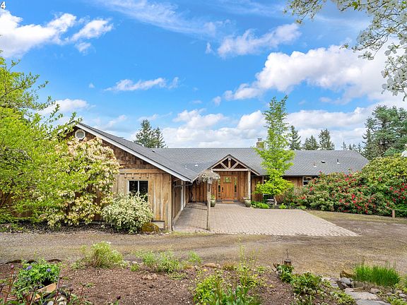 Welcome to your oasis of calm at this delightful 4 bedroom, 3.5 bath home, situated on a sunny park-like acre. Look for the charming puzzle exchange box near the entrance to a semi-circular gravel driveway leading to this gardener's paradise, discreetly set back from the road behind lush, established rhododendrons and mature apple trees. Conveniently located close to shops, restaurants, parks & highly rated West Linn schools. Upon entering the sizable foyer, views of Mt. Hood grab your attention through an oversize window in the expansive living room. A majestic stone fireplace flanked by custom built-in glass-fronted bookcases, soaring ceiling & beautiful wide plank fir floors create an elegant yet cozy setting. The adjacent dining room showcases custom vertical fir wainscoting, w/a sliding glass door opening onto a covered deck overlooking the blueberry & raspberry patches. The well-appointed kitchen features custom hickory cabinets, cherry floors, travertine countertops, a farmhouse sink, walk-in pantry & large center island w/bar seating. The appliances, including a new stove w/induction cooktop, are stainless steel. Adjoining family room offers several enticements: cozy up to a wood burning fireplace, explore the patio & herb garden, or step onto the deck to relax & savor the captivating sunset glow. Wake up to peaceful Mt. Hood views from the oversize primary suite, which features cork flooring & a substantial walk-in closet. Ensuite bathroom boasts hexagonal tile floors, tandem pedestal sinks & tiled walk-in shower. Downstairs you'll find 3 additional bedrooms & 2 full bathrooms. One bedroom w/ensuite bath, walk-in closet & private entrance. Large storage room & art studio/rec room w/fireplace complete the naturally bright lower level. Attached 2-car garage & free-standing shed provide additional storage. Located within Clackamas County, this unicorn property is zoned farm. Keep the garden green via a Rainbird sprinkler system w/water from your private well.