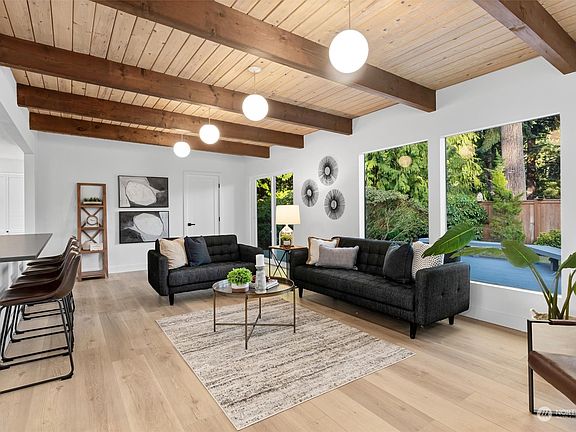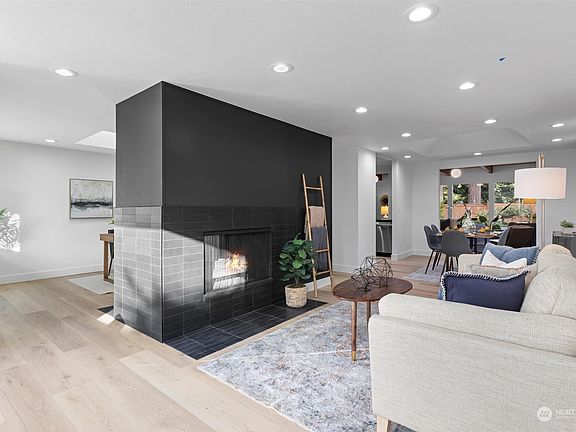 Beautifully updated one-level mid-century Shoreline home! Perfect for the modern lifestyle boasting multiple lvg areas, including formal lvg & flex space anchored by dual-sided FP. Dining, illuminated by lrg skylight, seamlessly connects to open kitchen, featuring rich quartz counters, contemporary cabs enhanced by modern fixtures & SS appliances. Expansive great rm, adorned w tongue & groove ceiling & walls of windows, opens up to walk-out deck leading to your private retreat, complete w hot tub. Bedroom wing offers a tranquil haven, w spacious primary suite featuring stylish 3/4 ensuite BA w brand-new finishes & fixtures. 2 more beds & full BA complete this exceptional & rare gem. Must see! Desirable schools & convenient to all amenities!