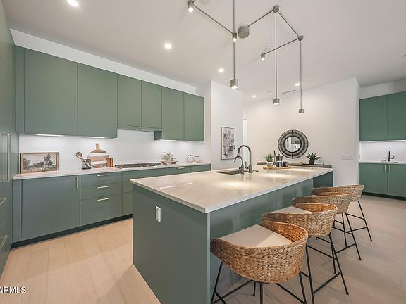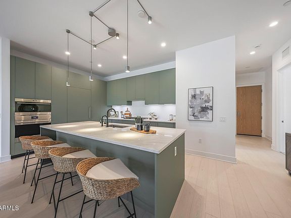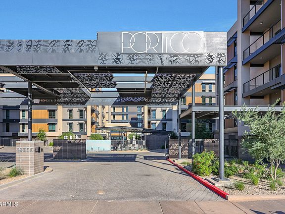 Welcome to luxury living at Portico, the exclusive 112-unit enclave nestled 2 minutes from your favorite North Scottsdale restaurants (plus Whole Foods) and 5 minutes from Grayhawk Golf Club & the TPC of Scottsdale. With 2 bedrooms, a den and 2.5 baths, your highly upgraded home features light wood floors and a chef's kitchen with sage green Italian cabinetry, integrated Sub-Zero/Wolf/Miele appliances and under-cabinet lighting. Elegant quartzite countertops throughout. Your great-room features a custom walnut media center (with TV) and a wall of telescoping sliding doors opening to your spacious terrace. Your primary suite offers motorized window shades (entire home), a bespoke walk-in closet and an oversized walk-in shower. Entertain in the clubhouse, poolside or at the BBQ pavilion. The clubhouse also features a state-of-the-art workout room and a complete kitchen and living room, giving you even more options for enjoying the Portico lifestyle--and sharing it with friends and family. And for your four-legged family members, there is a designated Doggy Splash Zone with water jets and fenced play space. Ground-level secure, designated parking completes your lock-and-leave Portico lifestyle.