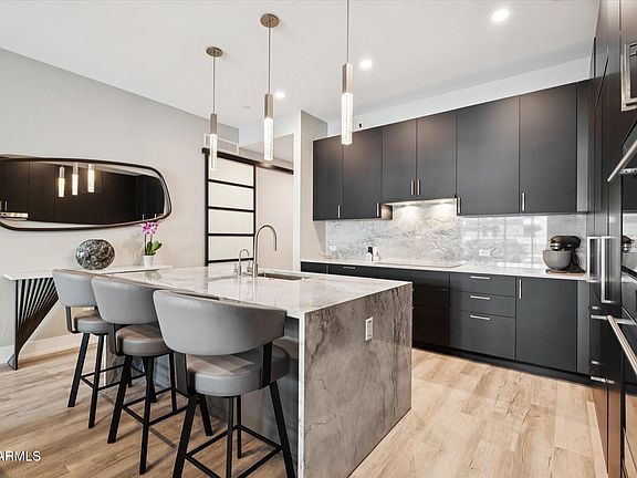 Luxury and convenience are forefront at Portico, the new community located in the highly acclaimed master planned community of ''One Scottsdale''. Extensive upgrades have already been completed making this a true turnkey, move in ready 2 bedroom + office/den, 2.5 bath home. This residence features one of the largest private, connected, rooftop terrace for seamless transition from indoor to outdoor living. Inside you are greeted with soaring ceilings, modern open concept design, 8' doors, and a wall of sliding glass to the terrace. The kitchen is fit for a chef while still being sleek thanks to island waterfall countertops and backsplash made of quartz, wrapping custom Italian cabinetry that tastefully integrates the Wolf, Sub-Zero, Bosch appliance package (choose between induction or gas cooktop, both included). Designer selected finishes include wall and window treatments, custom matching entertainment center and dry bar, California Closets, lighting package, wide plank flooring, spa like bathrooms with floating cabinetry and large format tile shower surrounds. The list of features and upgrades continue with the integrated audio visual equipment being included.