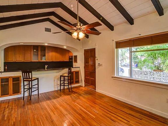 Key West style home. 3 Bedrooms with 2 on first floor and the third master bedroom on second floor. Two full baths. Remodeled kitchen. Vaulted celings. New roof 3 years ago. Electrical box replaced and outdoor service to outdoor electrical and gazebo service replaced two years ago. Harwood floors refinished. Deck rebuilt 3 years ago. New sidewalk, improved side porch stairs and coral surround underlayment improvements. Front picture window, kitchen window, garage window and front door upgraded to hurricane windows to match rest of impact windows. Modern large appliances including washer and dryer. Fully fenced with electric gate entry to pavers. Surrounded with mature greenery with a guanabana/soursop tree, mango tree, and other trees on the property. Tool shed added to property in addition to garage wall upgrades. Large front porch, small side porch adjoining french doors to dining area. Very large roofed back deck and extended unroofed sun section.