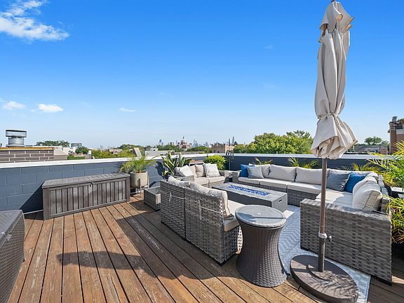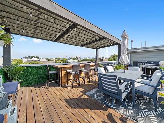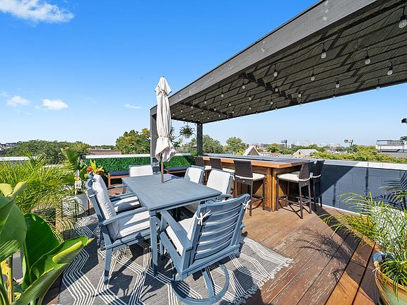 Welcome home to this stunning Bucktown 2Bed/2Bath newer construction PENTHOUSE with a bonus room and an expansive private rooftop deck-perfect for entertaining. From the moment you step inside, you're greeted with a spacious open floor plan. The gourmet kitchen features quartz countertops, a large island, custom cabinetry, and high-end Bosch appliances. The living room has 10-foot ceilings and oversized windows, filling the space with natural light and creating a warm, inviting atmosphere-ideal for both entertaining and quiet nights in. Throughout the home, you'll find beautiful hardwood floors and detailed custom trim work. The primary suite offers a spa-like retreat with heated floors, a steam shower with body sprays and a rain shower head and seperate tub. The second bedroom is perfect for guests or a home office. Step outside to your massive private rooftop deck that stretches from north to south with breathtaking skyline views, as well as a private terrace off the primary bedroom. The rooftop is fully equipped with a bar, pergola, and unique city views. Additional highlights include: New AC installed in July 2025, freshly painted in 2025, guest bedroom with electric fireplace, custom fireplace bench, and drapes, and one garage parking space plus ample street parking. Enjoy easy expressway access, the 606 trail, and just a short walk to Bucktown's vibrant restaurants and nightlife!