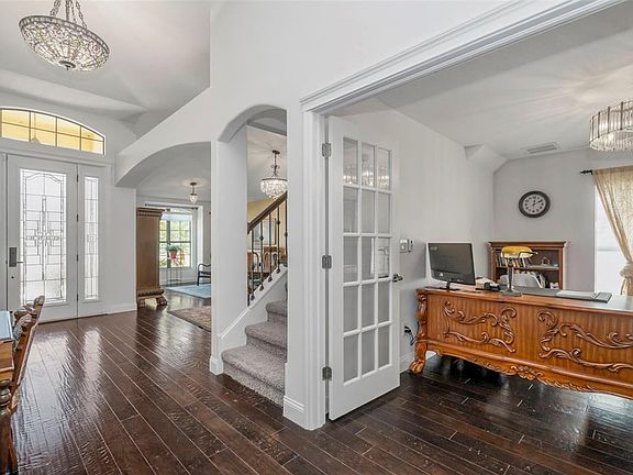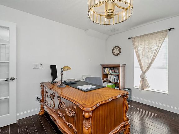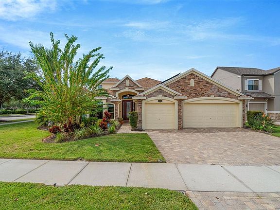 One or more photo(s) has been virtually staged. Elegance and craftsmanship define this stunning corner-lot pool home with pond views and access to community amenities. Wood-look tile flooring, decorative niches, custom window shades, Tiffany-style lighting, French doors to the den, and remote-controlled ceiling fans set the tone throughout. The gourmet kitchen is thoughtful and stylish. Featuring a tiled backsplash, window display cabinetry, breakfast bar, pull-out trash bin, walk-in pantry, and an office nook, all complemented by stainless steel appliances and whole-home pull-out drawer systems. The primary suite offers a serene retreat with a sitting area, lanai access, and a spa-style bath with a jacuzzi tub, walk-in shower, and double vanities. The custom cedar-lined walk-in closet is truly impressive, with hidden jewelry storage, valets, display windows, hamper bins, and plenty of adjustable shelving. Upstairs, a loft with wet bar, mini fridge, and half bath provides versatile living space for entertaining or relaxing. Outdoors, enjoy a heated saltwater pool with nebulous lighting, pavers in the pool and grill areas, and owned solar for the home and pool. Additional features include a 3-car garage, water softener and filtration system with sink dispenser, alarm system, two HVAC systems with UV lights, and a new roof (2023). With a low HOA in a highly desirable neighborhood, this move-in-ready luxury home truly has it all with so many upgrades and features you have to view for yourself.