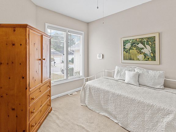 Golf Villa that overlooks the 16th green! Come play in Hedingham. This Pinehurst ranch plan offers separate dining, eat in kitchen, spacious family room with built in bookcases and fireplace, bay windows, skylights, 2 car garage, and large deck. Open floor plan allows you to view from the front door to the back door. Smooth 9 foot flat celings. Spacious main bedroom w/bay window, walk in closet, dual vanity sinks, and separate tub/shower. Refrigerator, washer and dryer to convey. Sellers offering a 2-10 Home Warranty. Convenient location with ease to shopping, gas stations, highways and medical care. Come make this your new ''Home''.