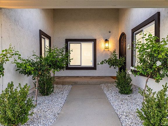 Reimagined and redesigned, this home showcases a true open-concept floor plan with soaring ceilings and a 15-foot multi-panel folding glass door framing panoramic views of the backyard and pool. The front yard offers clean curb appeal with a manicured lawn, mature date palms, planters, RV parking, and a welcoming courtyard leading to double arched iron entry doors. Inside, this virtually brand-new residence features wide-plank hardwood flooring, plantation-shuttered windows, a living room overlooking the front yard, an adjacent dining area, and a center-positioned kitchen. The kitchen is a showpiece with custom wood cabinetry, quartz countertops and backsplash, a center island with pendant lighting and seating, plus a separate buffet with a wine fridge and added storage. The adjoining family room highlights a modern linear gas fireplace, a flush-mounted 85” TV, and the expansive folding glass doors that flood the space with natural light and provide seamless indoor-outdoor living. The primary suite, accessed through double doors, features LED lighting, mirrored closet doors, and shuttered windows with backyard views. Its custom bath offers dual sinks with marble counters, gold fixtures, a frameless glass marble shower, and a striking marble accent wall. Three additional bedrooms, a remodeled hall bath, and a finished laundry room with cabinetry and counter space complete the interior. Additional upgrades include new interior doors and hardware, new HVAC system with ducting, and a leased solar system. Outdoors, the backyard is designed for entertaining with a pool and spa, a large grassy area, expansive decking, block perimeter walls, and rear planters with queen palms and ficus trees that will grow into a lush privacy hedge. The side yard features gated, fully concreted RV parking.