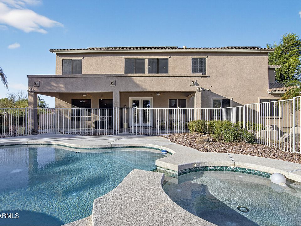 Step outside to your private resort-style backyard, featuring a covered patio with an outdoor kitchen and built-in BBQ, a sparkling pool and spa with custom lighting, and a sprawling grass area perfect for evening gatherings under the Arizona sky.