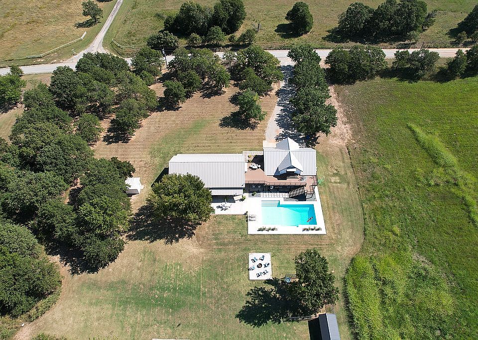 Beautiful private two-story farmhouse style home on 115 acres with 3 car garage. Great entertaining home with patios and two-story deck that overlooks the eleven acres of native grass pasture. Lots of wildlife with a 3 acre food plot, pond, and spring fed creek. Also offers an in-ground swimming pool and basketball court. Home is move in ready with three or four bedrooms, each with nice walk-in closets, and two full baths. Large room over the garage with a 3/4 bath and walk-in closet. Kitchen has quartzite countertops, center island, and walk-in pantry with ice maker. Second story has an office with walk-in attic for storage and great hangout space with more storge space.