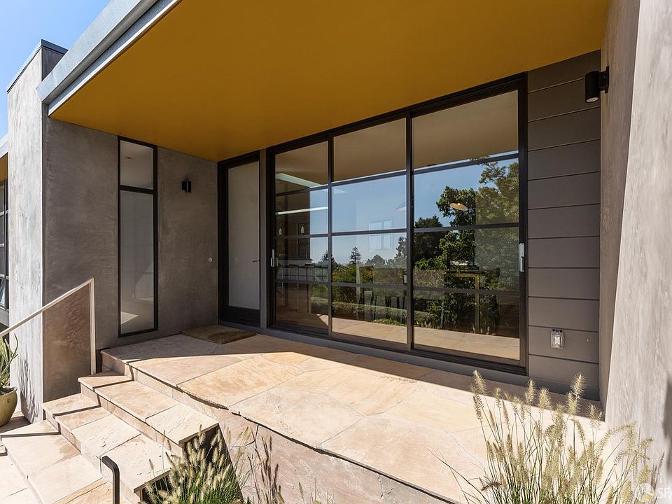 Situated amid the scenic beauty of Thousand Oaks, this mid-century eco-modern masterpiece embodies a seamless fusion of sustainability and contemporary aesthetics. Crafted anew by its previous owner-architect, it has earned accolades, gracing the pages of SF Chronicle. Fueled by solar panels, the residence stands as a paragon of energy efficiency, boasting radiant heat, EV charging, tankless water heaters, and ambient low-voltage lighting.Ascend the flagstone steps to encounter an airy, modern dwelling, enveloped by the natural allure of an oak tree and native rocks. Revel in panoramic views of Bay Bridge and SF through floor-to-ceiling doors and windows on both sides of the dwelling. The interior exudes sophistication with concrete counters, zinc accents, and top-tier appliances. Blurring the boundaries between indoors and outdoors, the rear flagstone patio provides an enchanting setting for soires. The third bedroom transforms into a versatile media haven, complete with a retractable screen and projector setup. The primary bedroom, featuring a walk-in closet and en-suite bathroom. A separate space beneath affords a guest retreat or office. Ideally positioned for a stroll to Solano, this home optimizes eco-conscious living, offering a refined lifestyle in Thousand Oaks.