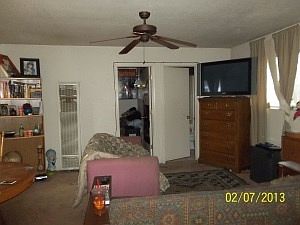 Small stucco home located near fairgrounds in Anderson. Two bedrooms one bath with additional room that is a den/study. One car attached garage with a two car carport. Wall heat, no a/c. Needs carpet.