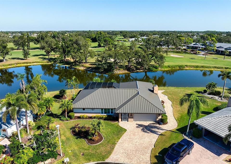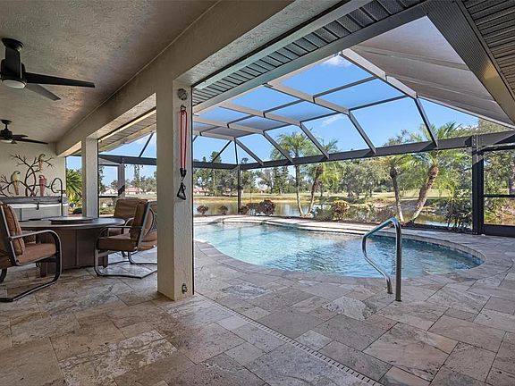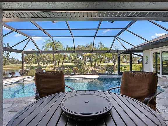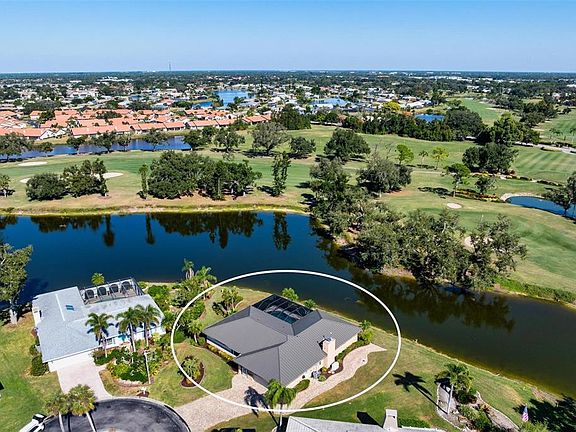 Set in the well-established and centrally located community of Jacaranda West, this updated 3-bedroom, 2-bath pool home enjoys a premium wraparound water and golf course setting with panoramic views of the signature 9th green. With over 180 feet of water frontage on more than a third of an acre, the property provides an exceptional natural backdrop where egrets, heron, cormorants, sandhill cranes, osprey, and even bald eagles are frequent visitors. Thoughtfully upgraded outdoor spaces embrace the tropical Florida lifestyle, featuring a saltwater pool with PebbleTec finish, travertine decking, a ClearVue cage, high-output heater, separate spa, and a spacious seating area overlooking the serene landscape. The home’s mechanical systems are in excellent condition, supported by a buried 250-gallon propane tank that feeds the whole-home generator, grill hookup, and poolside firepit table. Additional peace of mind comes from impact windows and doors, a storm-rated garage door, lanai shutters, third-nail reinforcement, and a 2024 standing-seam metal roof. Inside, recent improvements and warm, inviting finishes create a space that truly feels like home. A vaulted great room with fireplace and a wall of pocketing sliders opens seamlessly to the pool area. The renovated kitchen features soft-close KraftMaid cabinetry, generous drawer banks, and under-cabinet lighting, while the primary bedroom includes its own mini-split AC for personalized comfort. With low HOA fees, no CDD, both AC units replaced in 2025, added attic insulation, and a location just minutes from beaches, downtown Venice, Wellen Park, the Braves stadium, and everyday conveniences, this home offers a rare blend of quality, comfort, nature, and Florida living at its finest.