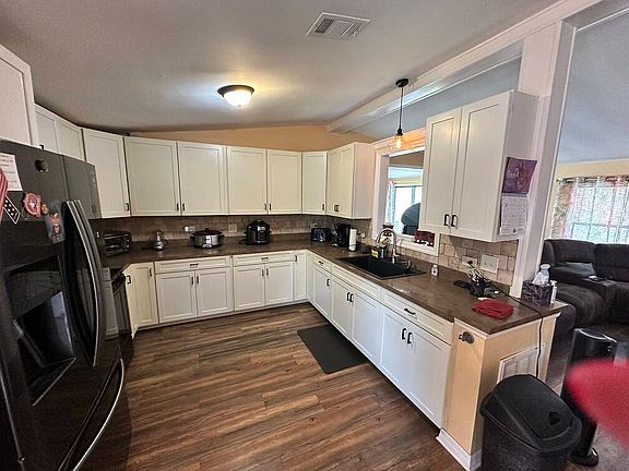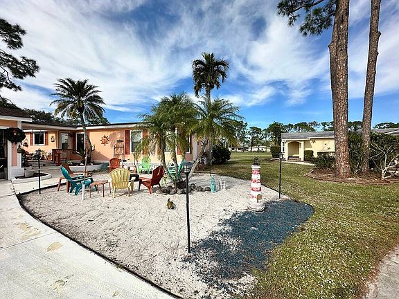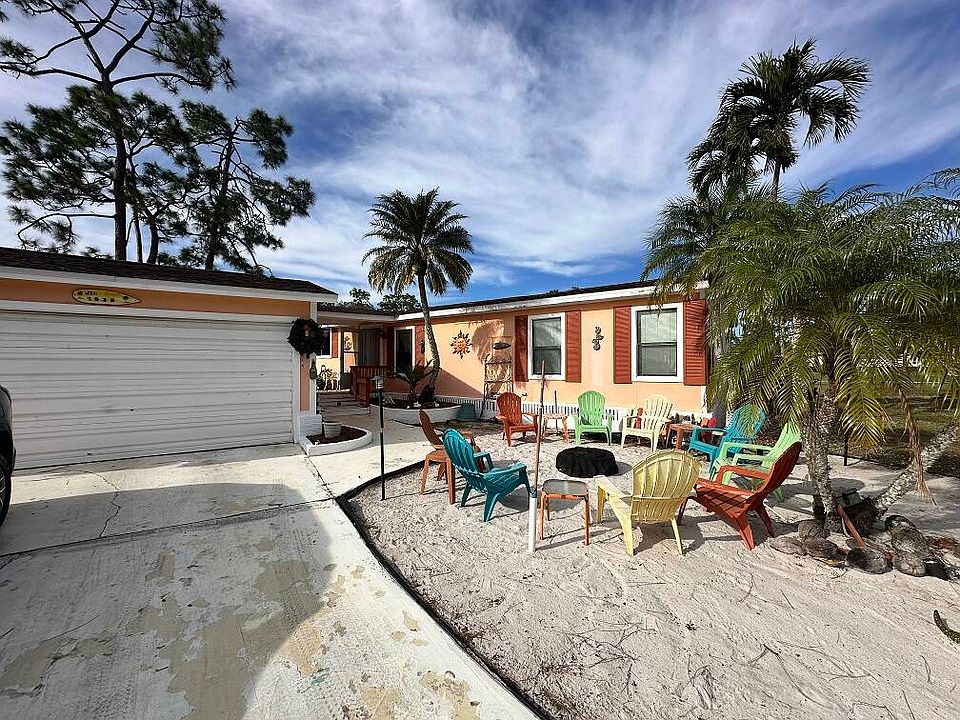 The Lot Rent for this home is $1,342.00/monthly. LOCATION, LOCATION, LOCATION! Well, cared for 2-bedroom, 2-bathroom home with views of the water and 2 holes of the golf course! As you approach the front of the home, you have a beachy area with palm trees perfect for relaxing. Home is being sold unfurnished. The kitchen is large with lots of cabinets and pantry closets. The kitchen has stainless steel appliances and great countertop space. The large open floorplan of the home brings lots of natural lighting. The living area flows into the dining room and has a panoramic view of the water and golf course. The dining room area also has a built-in desk with cabinets. The guest bedroom is a good size with a walk-in closet. The guest bathroom has a tub with a shower. The primary bedroom is large with cutouts for dressers. The primary bathroom has double sinks, several cabinets, a walk-in shower, and walk-in closet. The home has laminate floors throughout. The patio area is large size with views of the water and golf course. The home has a second patio off the dining room with a golf course view. Roof (2017) The home is located on a quiet cul-de-sac in the community.