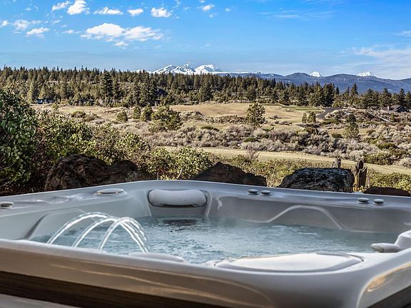 Majestic Cascade Mountains & Tetherow golf course views from this home will take your breath away. The rustic elegance of the interiors welcome you as enter the front courtyard & into the great room overlooking the spectacular views. Floor to ceiling masonry surrounds the 3 fireplaces, adding to the mountain ambiance. Designed to match the craftsmanship found in the Tetherow Lodge; artfully combining a rustic lodge aesthetic w/contemporary finishes. Mtn View kitchen features a massive island, Viking ovens, coffee bar, pantry & wet-bar. Main level primary suite enjoys a masonry fireplace, mountain views & luxurious bath, w/steam shower & walk-in closet. Main level inc. a charming den, while the lower level, designed for family & guests, features its own great room w/fireplace, patio overlooking the views & 2-King Suites, each w/full bath & patio access also a bunk room for overflow guests. Another full bath serves family room & bunk room. Easy access to Lodge Pools Fitness & Restaurant