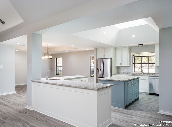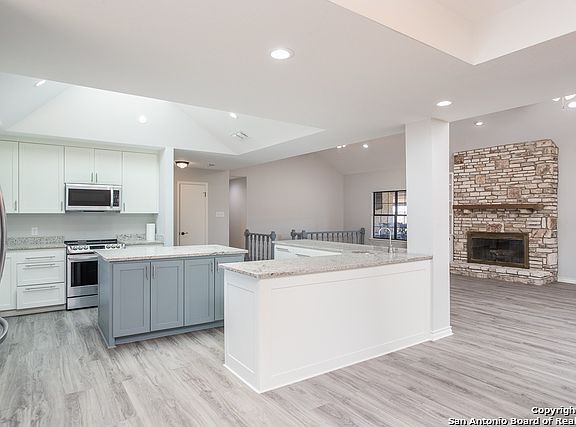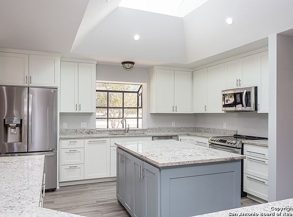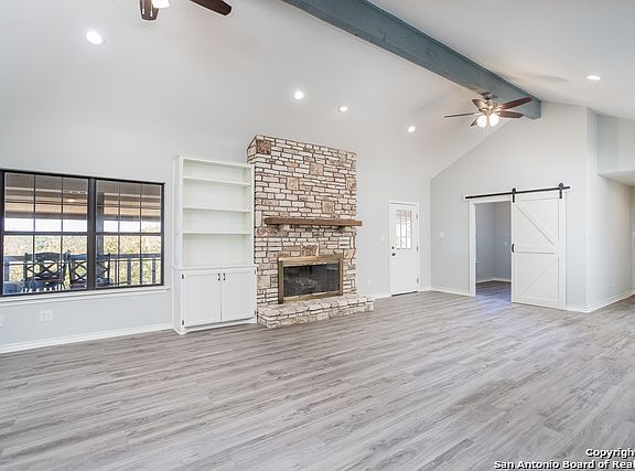 Rare larger acreage property close to Kerrville on prestigious James Avery Road! House has been completely remodeled, all new floors, paint, texture, new roof, complete kitchen redesign with new appliances, cabinets, and granite counters! Views from the hilltop are breathtaking, and overlooking your own private spring fed pond! Sit on your large back deck and watch the sunsets and Axis deer and Whitetail graze! Older house on property that could be remodeled, and very nice 30'x30' metal building!