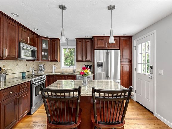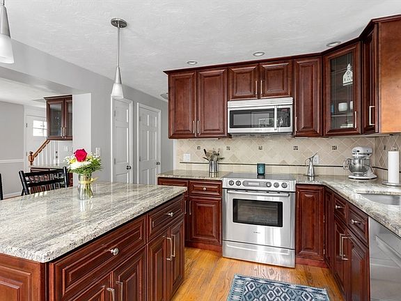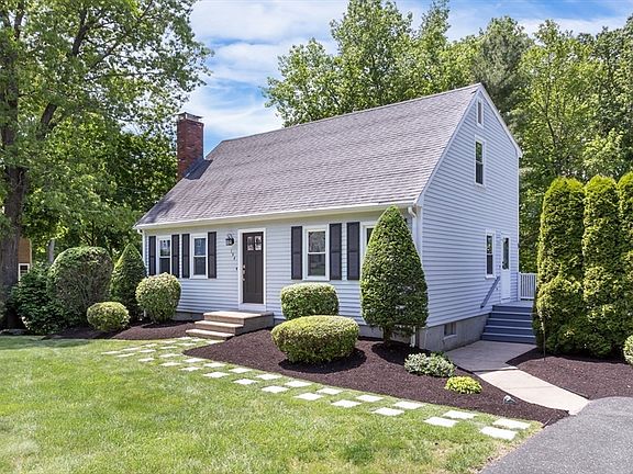 This Beautiful 3 Bedroom Cape is READY for you! Enjoy the bright open kitchen and dining room with granite counter tops, stainless steel appliances and hardwood flooring, great for entertaining guests. The dining room also has a built-in wine fridge and cabinets. Relax in the front-to-back living room with a wood fireplace for a cozy night at home. A slider to a private deck off the living room extends the outdoor eating season. Hardwood flooring is throughout the first floor along with a full bath. The second level has a large front-to--back bedroom with plenty of closet space, two additional bedrooms and a full common bath. The finished basement offers an additional den and office space, storage space, mudroom and the laundry room with a 1/2 bath. The large multi-level side deck overlooks a large level backyard with a fire pit. Shed is great for storage of outdoor furniture and equipment. Located on a quiet cul-de-sac, abuts conservation land. Easy access to Rte 495.