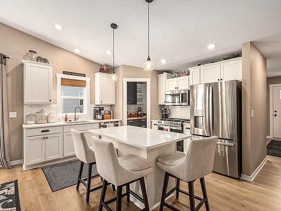 The kitchen is designed with modern touches, a center island, and a walk-in pantry that provides ample storage. The main floor also includes a convenient laundry room and a generous primary suite with an en-suite bath and walk-in closet.