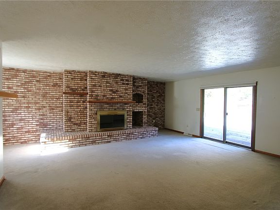 LARGE 18x15 Living Rm highlighted by Brick Wall Log Burning Fireplace & Sliding Glass Door to BIG, Mostly Private Side Deck.