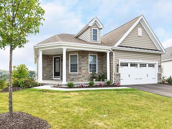 BETTER THAN NEW AND LESS THAN 2 YEARS YOUNG! Traditions of America at Sewickley Ridge 55+community RESALE with a basement! Why build when you can move right into this pristine maintenance free ranch home with OPEN floor plan. Fabulous private view from your back deck of State Conservatory (premium lot). Amazing kitchen has granite/quartz kitchen counter tops, six burner gas conv/oven, high-end stainless appls, engineered wood floors, Den may be a sitting rm. Beautiful Master ensuite has 2 closets (one lg walk-in). Vaulted ceiling in Family Room w/floor to ceiling stone front fireplace is flanked by large windows. Basement walls and ceiling are framed and await your finishing for 3rd bedroom, media rm, game rm, storage rm and plumbed for full bath with French door walk-out to patio below maint. free deck. Sec. sysLow HOA fee covers grass, landscaping, snow removal, exterior home maintenance, clubhouse w/heated pool, fitness ctr,sports bar, tennis courts and many social activities.