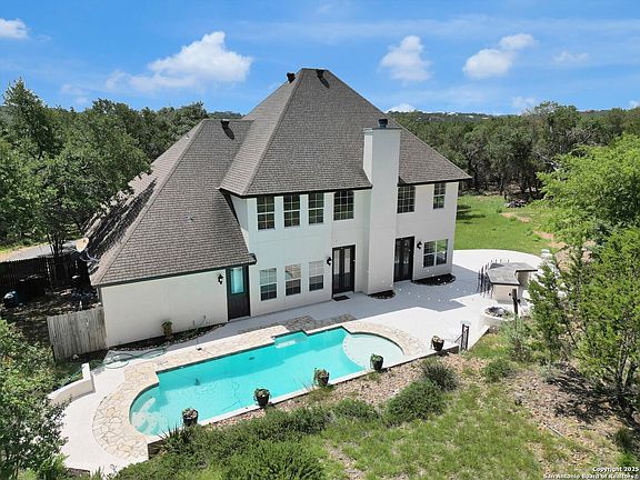 Major price reduction! Discover refined Hill Country living in this elegantly renovated 4,057-sq-ft residence, tucked at the end of a quiet cul-de-sac in Spring Branch's coveted River Crossing. Nestled on 2.09 secluded acres, the home welcomes you with soaring ceilings, walls of windows, and a free-flowing layout that's perfect for everyday life or grand entertaining. At the center of it all is a show-stopping chef's kitchen: quartz countertops, an oversized island, stainless appliances, built-in oven, and a generous walk-in pantry. Living and dining spaces connect seamlessly, creating an easy backdrop for get-togethers. The main-level primary suite feels like a spa retreat, highlighted by a brand-new walk-in shower, designer tile, and quartz-topped vanities. Throughout the home, every detail is refreshed-updated plumbing and lighting fixtures, luxe vinyl plank floors downstairs, and plush carpeting upstairs. Need space for work or play? A private study and a large game room have you covered. Step outside to your own resort: a sparkling pool, built-in grill, and fire-pit terrace overlooking sweeping Hill Country vistas. As night falls, the sky lives up to the address-"Night Sky"-with breathtaking stargazing. Set well back from the street for true estate-style privacy, the property still offers quick access to highly rated Comal ISD schools. If you crave luxury finishes, peaceful surroundings, and unrivaled outdoor living, make your appointment today.
