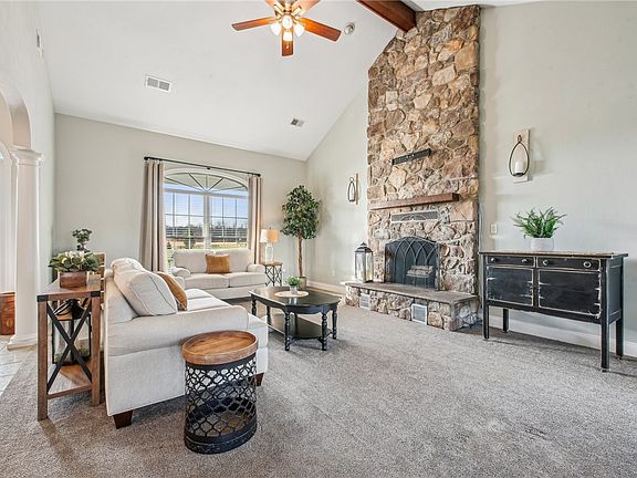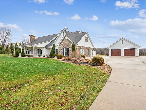 Beautiful custom built sprawling ranch-style home sitting on almost 11 acres of picturesque land, offering the perfect blend of modern comfort and country living. Enter through the welcoming and stylish foyer into the living area with cathedral ceilings and stone fireplace. French doors, large windows, charming wood work and aboundant natural light throughout. Views of the beautiful back yard surrond the kitchen with cherry cabinets, quatz counter tops and stainless steel appliances. The primary suite includes a luxurious en-suite bath and a walk-in closet. Step outside to your covered patio, accessable from the living room, kitchen and primary suite. A spacious game room and bonus room allow for additional living space or guest quarters. Outside you will find a large covered front porch, a two car garage with second floor, two additional storage buildings, an adorable goat yard and duck/chicken coop. This is such an exceptional rare find! Don't miss out.