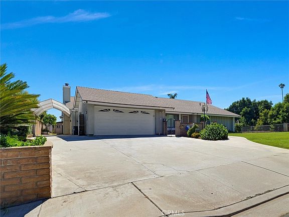 Spacious 5-bedroom, 3-bath home on an expansive 14,000+ sq. ft. cul-de-sac corner lot with a sparkling in-ground pool! This property includes a versatile approx. 550 sq. ft. room addition featuring its own living area, the 5th bedroom with a walk-in closet, and a bathroom—ideal for in-laws, a teen suite, office, or guest quarters. A covered breezeway seamlessly connects the main house and addition. Inside, you’ll find both a living room and a large family room with soaring wood ceilings, dual ceiling fans, and a cozy brick fireplace. The updated kitchen boasts quartz countertops, stainless steel appliances, recessed lighting, gray cabinetry, and extended built-in shelving. The primary suite offers a walk-in closet, private bathroom, and slider to the backyard. Another bedroom is currently outfitted as an office with custom built-ins. Enjoy outdoor living with a huge fenced backyard featuring a pool (also additionally fenced), covered patio with lights, firepit, bar area, and sheds for pool equipment and the included ride-on mower. The oversized lot also provides a spacious front yard, ample driveway parking, and extra side parking for another small car. Additional highlights include a newer roof (approx. 5 years), direct access 2-car garage with laundry hookups, and minimal carpet—only in the family room, the rest is either hardwood floors or laminate. No HOA. This home blends everyday comfort with plenty of space for entertaining, offering flexible living options and room to grow.
