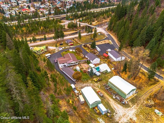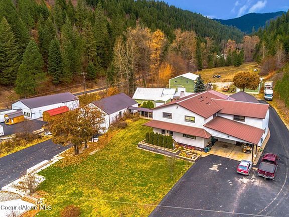 Sitting on 28 acres of beautiful land, this home is made up of multiple property elements and affords a wealth of space and potential. Includes a beautiful Main House with View, an attached 2 Car Garage, a Scenic Guest House, as well as Three Rental Units, Commercial Office Space with Paved Parking, an RV Garage, and 3 Out Buildings. This property is situated in a beautiful part of the Silver Valley, across the street from the Coeur d'Alene River.