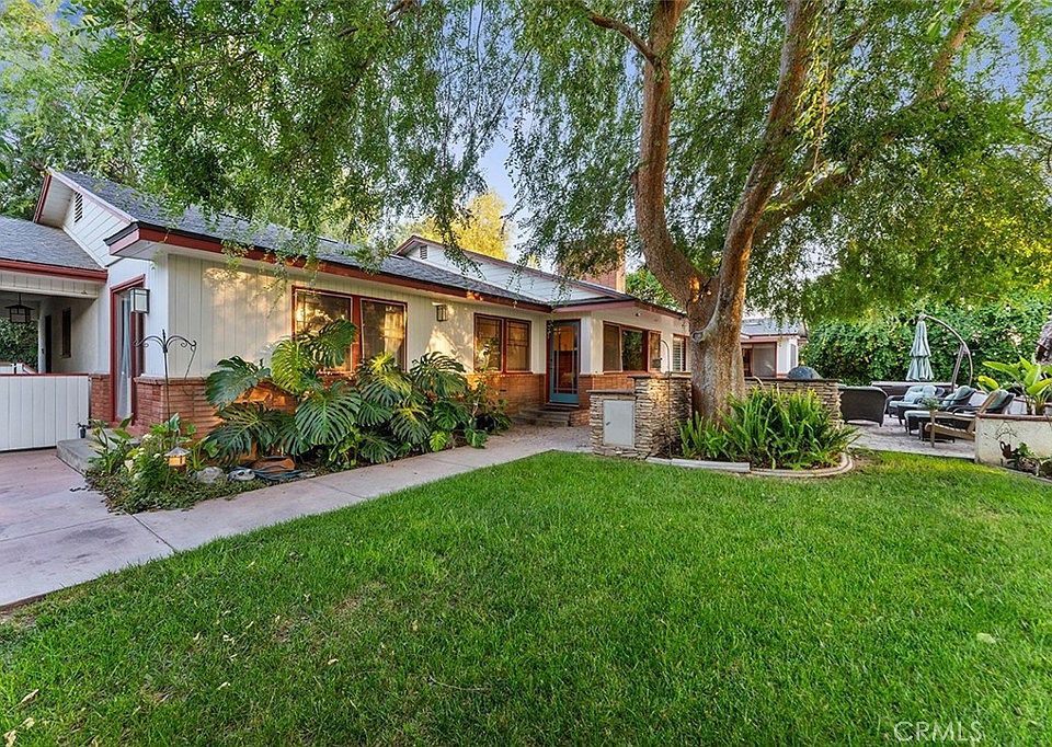 The heart of the home is anchored by an expansive living room, where original built-ins & light fixtures whisper of the home's heritage. The open hallway showcases opposite of custom cabinetry leads to three of the four bedrooms, one of which enjoys private access through sliding doors to the shaded front yard; a tranquil space that lives like a second backyard. The front yard also has a swing bench in front of the entry & has just enough space for a dining set or patio furniture.