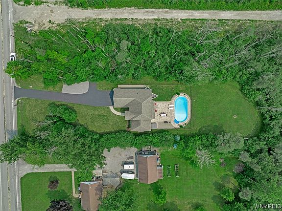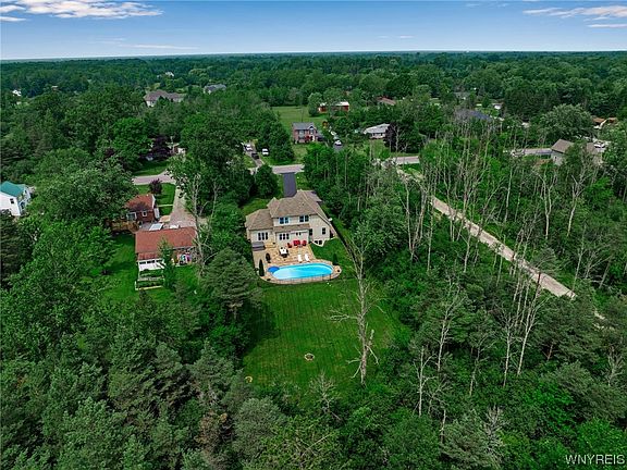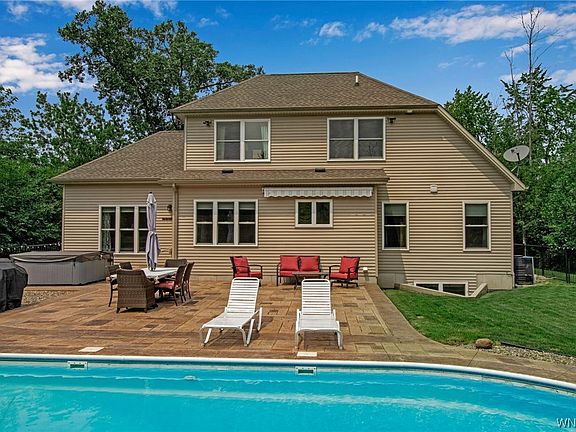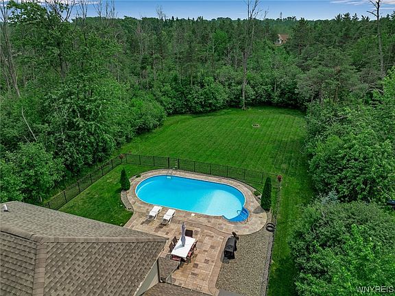 Absolutely stunning, custom built home in the town of Elma. Lovely layout consisting of 3 beds, potential 4th & 2.5 baths! Stately 2 story foyer with views of the detailed staircase. Spacious LR has a cozy FP w/ marble tile & mantle to decorate. Open concept DR & Kitchen overlooking the backyd! Modern kitchen w/ ample storage, gorgeous granite counters, white subway tile backsplash, island & SS appliances included. Primary bedrm on the 1st flr w/ tray ceiling detail, WIC & ensuite bath. Hidden 1/2 bath in hallway. 1st flr laundry near the 2.5 car attached garage. Durable bamboo hardwd flrs & some newer carpeting. Basement stairs lead you to the lower level w/ finished living space, egress window, perfect for 4th bed option or home office. Unfinished side great for a home gym! 2 equal size bedrms on 2nd flr & full bath w/ shower/tub & linen clo. Backyrd feels like a resort! Perfect spot to entertain. In-ground pool w/ stamped concrete & fully fenced in area. Private lot is over an acre, 100' wide x 440' deep. Buttoned up curb appeal & freshly sealed driveway. Highly sought after Iroquois School Dist & 5 mins to Rt 400! Pro measured sq ft. Affordable Elma town taxes: $7,825!