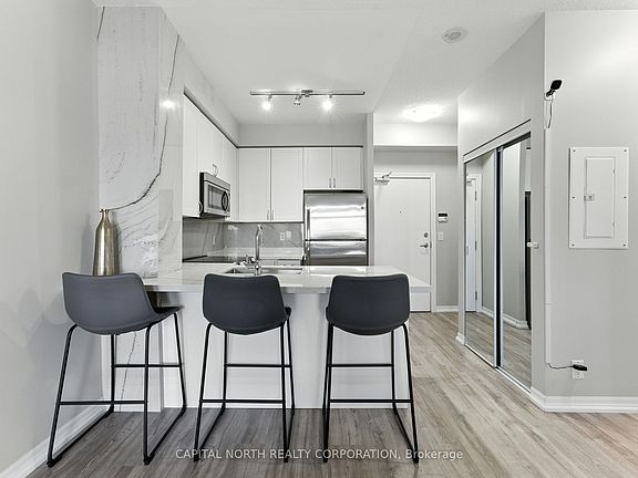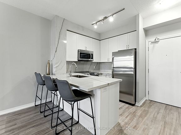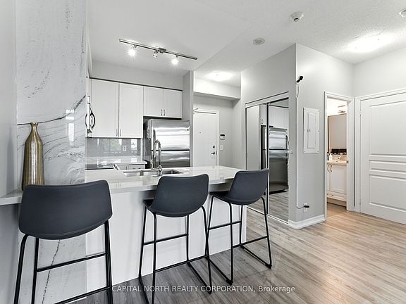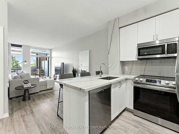 Discover Modern Urban Living In This Beautifully Designed 1-Bedroom, 1-Bathroom Suite Offering 590 Sqft Of Smartly Utilized Space. Perfectly Positioned In The Highly Desired Ironstone Condos, This Unit Blends Style, Comfort, And Functionality In One Impressive Package. The Bright, Open-Concept Layout Is Enhanced By Floor-To-Ceiling Windows And A Sought-After Southern Exposure, Filling The Home With Natural Light. The Contemporary Kitchen Features Premium Mont Blanc Quartzite Countertops, Sleek Cabinetry, Stainless Steel Appliances, And A Breakfast Bar Ideal For Casual Dining Or Entertaining. Additional Upgrades Include Stylish Laminate Flooring Throughout, A New Oven, And A New Washer & Dryer For Added Convenience. The Spacious Living Area Flows Effortlessly To Your Extra-Large Private Terrace A Rare Find Perfect For Outdoor Dining, Lounging, Or Gardening. The Bedroom Offers A Peaceful Retreat With Spacious Walk In Closet, While The Elegant 4-Piece Bath Features Modern Finishes. Enjoy Resort-Style Amenities Including A Fitness Centre, Games Room, Party-Media Room, Concierge Service, And Visitor Parking. One Parking Space And One Locker Are Included. All This Just Steps From Grocery Stores, Restaurants, Shops, And Minutes From Major Highways Making It The Perfect Blend Of Luxury And Convenience. Whether You're A First-Time Buyer, Downsizer, Or Investor, This Chic Suite Is A Must-See.