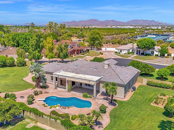 If you're searching for a spacious grassy cul-de-sac lot w/ no HOA & a stunning home, this is it! Step inside through the grand entrance and feel instantly welcomed by the spaciously elegant formal living & dining rooms, featuring soaring coffered ceilings, a cozy fireplace, & breathtaking views of the grounds & Arizona sunsets! The kitchen is a chef's dream with ample cabinetry, granite countertops, a center island, workstation, and a charming breakfast nook. The master suite offers a peaceful sitting area and a luxuriously remodeled bath. The game room is perfect for fun and relaxation, with plenty of space for a pool table, arcade games, or media setup. Outside, enjoy a gigantic backyard with an entertainer's patio, lush greenery, mature trees (& fruit trees), plus a fertile garden for the green-thumb and sparkling diving pool with natural rock waterfall for lots of fun in the sun. High quality fence is stored and available for quick setup. Don't miss your chance to own this private, no HOA one-of-a-kind property!