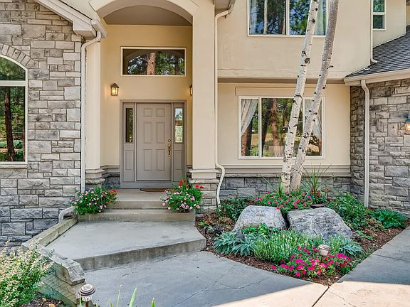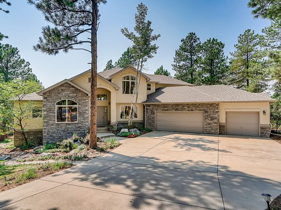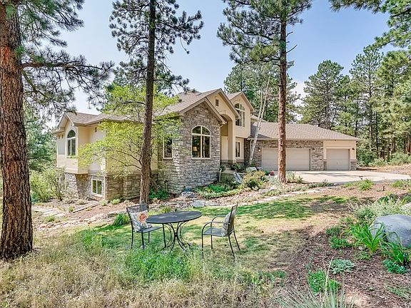 Quality mountain contemporary nestled on private pine tree acreage! Main floor master suite with the cozy romance of it's own fireplace, double walk-in closets, and 5 piece master bath. Front of the house study, formal dining room, and large hub-of-the-home kitchen open to the great room. Kitchen appointments are granite, stainless steel appliances, Thermador range, double ovens, center island, and large sunny eating space to watch the abundant wildlife. Beautiful laundry room on the main level. Huge unfinished walkout basement with 9' ceilings and rough-in for bath. Exterior living space includes 37x12 deck partially covered with glimpses of mountain views through the trees, and stamped concrete patio on basement level. 3 more bedrooms and 2 baths on the upper level. Lives like a ranch style on the main-level. Minutes away from Bear Dance & Perry Park golf courses. 25 min. to DTC