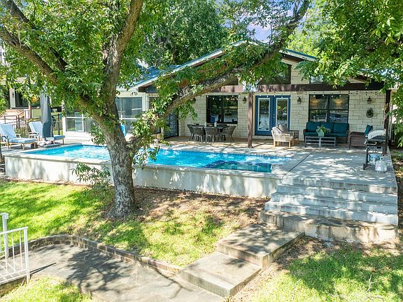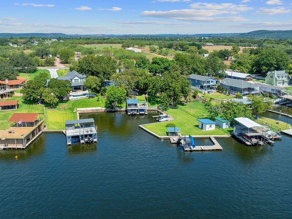 Over 300 feet of Lake LBJ shoreline, a delightful pool and spa, and endless lake-life amenities make this 6-bedroom, 4-bath updated property one of Kingsland’s most unique waterfront homes. What truly sets it apart is the protected cove: perfect for safe swimming and relaxing; away from boat traffic. A lakeside platform with diving board, slide, and two levels of swings offers fun for all ages. Set on over an acre with mature trees, this spectacular property includes a main house and private guest casita. The main residence features two primary suites, two guest bedrooms, three bathrooms, and a spacious family room with an open-concept kitchen. A sunroom extends off one of the primary bedrooms, providing a peaceful retreat with views of the water. The casita offers its own two bedrooms, kitchenette, and full bath; ideal for guests, a kids' area or multigenerational living. All less than 10 minutes from HEB. A large covered back patio overlooks the lake and leads to the pool and spa. Just steps away, an expansive covered two-slip boat dock with oversized party deck, four separate jet ski docks, and a convenient boathouse provide everything you need for waterfront living. This property delivers it all: main-lake and cove frontage for fishing and swimming, resort-style outdoor amenities, and an updated home ready to host gatherings both large and small. Whether entertaining a crowd or enjoying peaceful mornings by the water, this home offers the ultimate in Lake LBJ living.