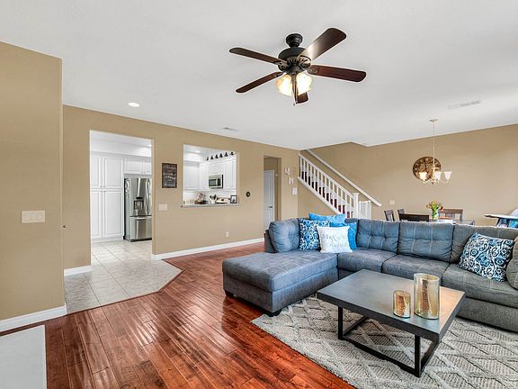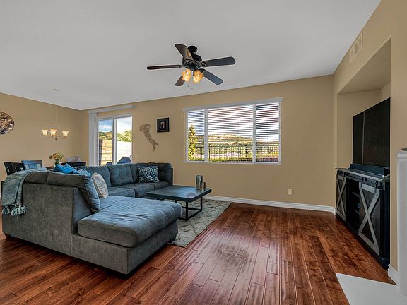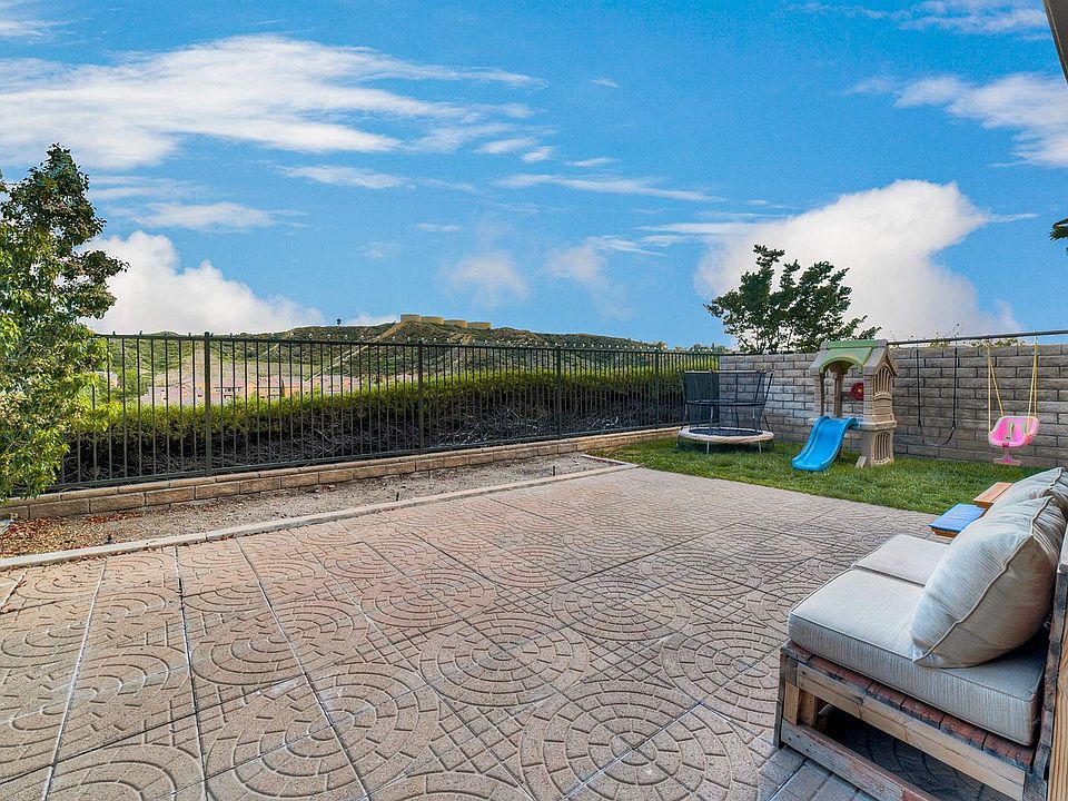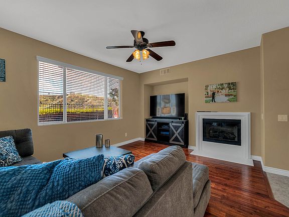 PINTERESTY 3+2.5 Mariposa Townhome with Stunning Views from the Large Backyard, No Mello-Roos, Low HOA and NO Rear Neighbors! The interior highlights ceiling fans, recessed lighting, nest thermostat and ring doorbell, dual pane windows. Modern open floor-plan, with 9-foot tall ceilings, light and bright living room with fireplace, upgraded flooring and opens to the cozy dining area with a slider out to the large yard and views of SCV. Upgraded eat-in kitchen off of the living room with tons of storage, granite countertops, and stainless steel appliances. Downstairs guest bathroom with a custom faux wood accent wall. Upstairs find a stunning built-in desk area which would be perfect for a homework area, craft station or even a home office. Inviting master suite with dual his/her sinks, glass enclosed tub/shower , separate water closet, and large walk-in closet. Two secondary bedrooms with raised panel closet doors, shutters, ceiling fans and one of the rooms has a custom faux wood accent wall as well!!! Large and private hardscape and landscaped yard with grassy area, no rear neighbors and VIEWS FOR DAYS!!! 2 Car garage attached garage with high ceilings. Incredible resort-like pool and spa, BBQ cooking areas, and kids playground. This home is turn-key and ready for its next owner!