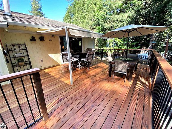 Immaculate turn-key house on spacious .6 acre flat lot! Built in 1987, this single level 3 bedroom has been lovingly upgraded and maintained by the full-time owners for 22 years. The rear redwood deck with retractable awning is entirely BRAND NEW, and ready for you to enjoy the tall pine, fir, oak, cedar, liquidamber and quaking aspen trees that surround it. The front covered porch with awning extension is shady all day. One front driveway goes to the attached 2-car garage, and the other angles gently to accommodate large RV's or boats. Both connect to a circular driveway around the house. Bamboo floors flow through the entry, hallway, kitchen, dining, living, and bathrooms. Bamboo is easy-care, eco-friendly, and very scratch resistant. Kitchen has white cabinets, 2015 white appliances, gas range, pantry, stainless steel apron-front sink, gray quartz tile counters and backsplash, ceiling fan and recessed ceiling lights. Living area of the great room has a wet bar, cathedral ceilings, sliding door to deck, wood stove on slate rock hearth, and ceiling fan. Bedrooms are carpeted, and all 3 have ceiling fans. Guest bedroom is 11 ft X 15 ft, and the master is 14 ft X 15 ft. Master suite has two large closets with built-ins, two sinks and a roomy shower. Dual pane windows have a variety of window coverings: pleated shades, mini blinds, sheers, cloth drapes. Septic system leach field is BRAND NEW. The gray concrete tile roof is all up to snuff, and could last a lifetime. The seamless gutters with leaf guards and downspouts are BRAND NEW. Seller will provide pest clearance and home warranty. Newer central heat and air conditioning dual pack is tuned up and in great shape. (Ask Realtor for invoices). Lots to see here and appreciate. Ask Realtor for detailed Description of Features, and list of appliances and personal property included. All windows have energy-efficient light/heat blocking screening. New deck has been reinforced for future hot tub. Enjoy more fresh air relaxation under the gazebo in the shady southwest property corner. Room to add a vegetable garden, orchard, bocce ball court, separate garage or shop, or use your imagination. Part of the Pine Mountain Lake Subdivision, with beaucoup amenities: private lake, beaches fishing, sailing, water skiing, swimming pool, 18-hole golf course, restaurant and bar, stables, campground, tennis, pickleball, archery and shooting ranges. Homeowners Association dues are $217 per month. Located 2.5 miles to the town of Groveland, and 25 miles to Yosemite National Park. Seller will consider offers contingent on closing on another property. Offers must be accompanied by verification of cash funds and/or lender pre-approval.