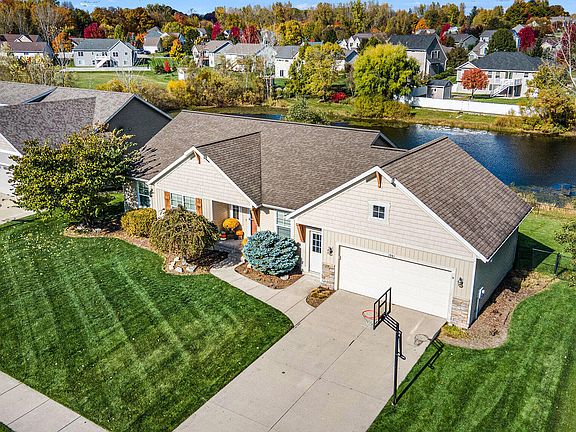 Beautiful 5-bedroom, 3-bath ranch in the sought-after Planter Row neighborhood overlooking a peaceful pond. The open main floor offers bright living spaces, vaulted ceilings, and a modern kitchen with stainless steel appliances and a large island. The primary suite features a private bath and walk-in closet, with two additional bedrooms and a full bath completing the main level. The finished lower level features a spacious family room, two additional bedrooms, a full bathroom, and ample storage. Enjoy stunning pond views from the back deck and relax in this serene setting, conveniently located near Byron Center schools, trails, and shopping.