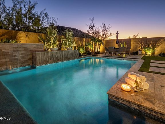 Nestled on a premium lot with mountain views and no rear neighbors, this home offers ultimate privacy. The backyard is an oasis, surrounded by lush greenery. Enjoy a sparkling pool with an in-floor cleaning system, two water features, and a Baja shelf to sit and soak in. Multiple outdoor areas invite relaxation and entertaining, from the built-in BBQ station and covered patio to the cozy fire pit, perfect for chilly Arizona evenings. There is also a Smart home app available for seamless finger tip home control.