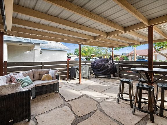 This updated 3 bedroom, 2 bathroom home offers an open layout with a remodeled kitchen featuring new cabinets, new countertops, new appliances, new gas range, new hood, new farmhouse sink, new faucet, an island with more storage, recessed lighting, and a skylight. Interior updates include new flooring, baseboards, and paint, plus a built in banquet in the dining area. The primary suite has dual sinks and a walk in shower, all bedrooms have mirrored closets and ceiling fans. The home includes full solar and no carpet. The exterior provides a private front patio, partially enclosed for privacy and great for entertainment area, a covered back patio with artificial grass, a large almond tree, a 2 car garage with built in storage, a storage shed, and garden beds. Great location, within a short distance to shopping and I-40.