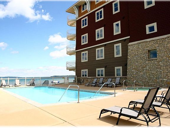 High-End Luxury Waterfront, Bay View, Sandy Beach Condo with outdoor heated pool, hot tub and built-in grills. Located just four miles from downtown Traverse City, this gorgeous condo overlooks the crystal waters of the bay. Large, unique to all condos in this building is its circular window in the living room. This condominium unit has carpeted flooring, granite countertops, walk-in closets, as well as many tasteful and unique personal touches that make it stand out as refreshing, sophisticated, and authentic. And pet friendly. Upgrades: Custom pantry, Stellar Kitchen, freshly painted. Numerous amounts of fun: the Sandy Beach, Bay views, crisp clean condo, luxury relaxed tempo, pool, hot-tub, grills 3rd floor owners common room plus close to bike-trail. Garage buy-in available in the fall.