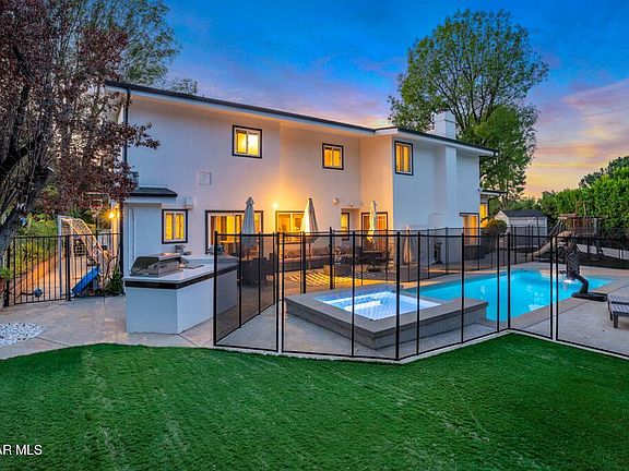 Exquisite Remodeled Tarzana Residence - Perfectly positioned on a tranquil cul-de-sac nestled between the lush fairways of Braemar Country Club, this stunning 5-bedroom, 5.5-bath home embodies the very best of refined luxury, modern design, and effortless Southern California living. Completely reimagined with exceptional craftsmanship and the finest designer finishes, every detail has been thoughtfully curated to balance sophistication with comfort—creating a residence as inviting as it is impressive. Ideal for both grand-scale entertaining and intimate gatherings, the home is framed by manicured landscaping and a serene natural backdrop that set the stage for timeless elegance. Framed by lush, manicured landscaping and a serene natural backdrop, this beautiful residence welcomes you with timeless sophistication from the moment you arrive. Beyond the double-door entry, a grand foyer introduces an interior defined by scale and grace. High ceilings, elegant crown molding, neutral palettes, and rich wood flooring create a harmonious flow through the formal living and dining areas—ideal for hosting memorable dinner parties or festive celebrations. A chic powder room completes this level.Step down into the heart of the home where the entertainer's kitchen takes center stage, showcasing top-of-the-line stainless steel appliances, bespoke cabinetry, striking quartz countertops, and an expansive center island with seating for many. The adjoining breakfast nook, cozy den, and inviting family room—anchored by a fireplace—offer a perfect blend of comfort and sophistication.A versatile main-level bedroom with an ensuite bath provides the flexibility of a private guest suite or a stylish home office. A well-appointed laundry room with abundant storage and direct access to the attached two-car garage add everyday convenience.Upstairs, the vaulted-ceiling primary suite serves as a tranquil retreat, complete with a generous walk-in closet and a spa-inspired bath featuring dual vanities, a soaking tub, and a separate shower. Two additional secondary bedrooms—each with walk-in closets—share access to a beautifully updated hall bath with dual sinks, while one of these bedrooms enjoys the added benefit of a private ensuite bath. An elegant in-law suite, located on the same level as the primary and secondary bedrooms, provides additional comfort and privacy with its own full bath.Glass sliders open to a secluded backyard oasis designed for year-round enjoyment. Enjoy a resort-style pool and spa surrounded by mature greenery, an outdoor BBQ area, artificial turf play space, swing set, and multiple lounge and dining zones—each perfect for relaxing or entertaining beneath the California sky. A pool safety fence and storage shed complete this thoughtfully designed outdoor haven. This remarkable Tarzana residence delivers the quintessential Southern California lifestyle—elevated in every way.
