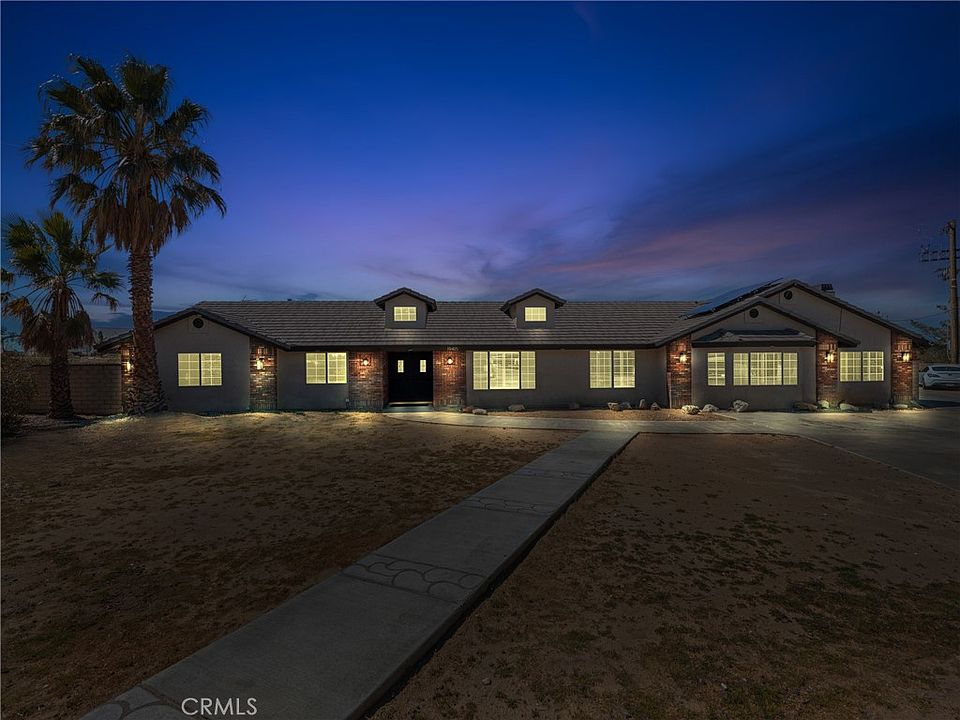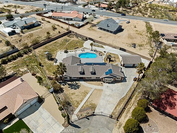 *IMMACULATE CUSTOM BUILT HOME BOAST 3492 sqft * PRICED TO SELL * MOTIVATED SELLER * OWN IT WITH PAID OFF SOLAR * FINISHED DETACHED 3-CAR GARAGE*. Located at the end of a cul-de-sac, in a HIGHLY DESIRABLE area. This SPACIOUS floor plan offers high grade saxony carpet and wood slats tile flooring. Recently upgraded A/C unit, tankless water heater, and pool pump. Freshly remodeled bathrooms. All redone so you can enjoy great times with friends and family! You will immediately feel welcomed when entering this METICULOUSLY maintained home. LARGE formal living and dining room. The great room is spacious and cozy with a brick fireplace that extends all the way up to the ceiling and a window that shares both brightness and views of the city that leads you onto the mountains. Media room is easily accessed through the open concept kitchen that has ample counter space and a beautiful breakfast nook. The laundry room, just off the kitchen, offers additional storage space as well as a powder room for guests. Each bedroom is fresh and bright. The master bedroom with double sinks, a garden tub and tiled glass shower, has ample space with room for a sitting area, and access to the backyard. The backyard offers more than just a CRISP POOL and spa for enjoyment….YES…YES…YES!!! The view you have while swimming or enjoying the covered patio is priceless! As you enjoy the view of the Victor Valley area and surrounding mountains, you are also guaranteed front row seats to the finest fireworks show in the high desert!! Don’t miss out on this opportunity!