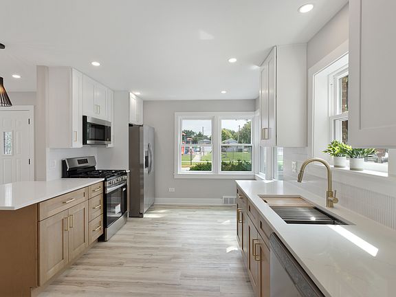 Welcome to 1942 S 15th Avenue, Broadview - a beautifully renovated brick Cape Cod offering 3 bedrooms, 2 full bathrooms, and a spacious layout designed for modern living. From top to bottom, this home has been thoughtfully updated with today's buyer in mind. Step inside to find a bright, open-concept main level with recessed lighting and luxury flooring throughout. The spacious living room flows seamlessly into the chef's kitchen, featuring white shaker cabinets with contrasting wood-tone lowers, quartz countertops, a island with seating, tile backsplash, and a full stainless steel appliance package. The main level also includes one bedroom and a fully remodeled bathroom with designer tile and modern fixtures. Upstairs, you'll find two additional bedrooms, a stunning second full bath with a glass-enclosed walk-in shower, and a walk-in closet offering ample storage. The lower level provides laundry hookups and plenty of room for future finishing or storage. Enjoy outdoor living in the large fenced backyard, perfect for entertaining. A two-car garage with fresh siding completes this move-in ready property. Additional updates include: new windows, doors, trim, lighting, flooring, plumbing, and electrical upgrades. Located on a quiet block, this home offers easy access to schools, parks, shopping, dining, and major expressways. Truly turnkey - nothing to do but move in and enjoy!