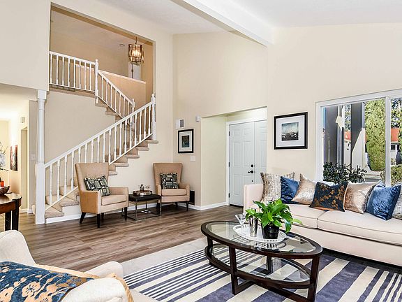 Stunning 4 bed 2.5 bath home w/2000+sf. Soaring ceilings, lots of light, new wide plank floors, carpet & more! Huge master w/vaulted ceilings & updated bath. Large eat-in kitchen w/granite & breakfast bar, opens onto versatile family rm w/cozy fireplace. Gorgeous yard w/pool, spa & no side neighbor.