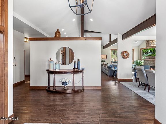 This impeccable, 5,200 sqft. 4BD/4.5BA, single family home in Post Falls features both modern amenities and architectural character in the best location! Quiet, peaceful, country living is just 5 minutes from I-90 at Stateline. Sitting just 15 minutes from Spokane or CDA, this home checks all the boxes! The main floor of the open concept home is ADA accessible with porcelain tile throughout. Perfect for any entertainer, the gourmet kitchen boasts an oversized island, Bosch cooktop, double ovens, as well as a formal dining area, cozy breakfast nook and dry bar. Additionally, each bedroom features an ensuite to fit any need. While entertaining indoors in the large basement/recreation room, or outdoors, on the covered patio you will experience ultimate privacy. You will never run out of room with the 4-car garage and immense storage. Nestled on 8 private acres of treed property, sit around the firepit, listen to the water feature and watch all the surrounding wildlife.