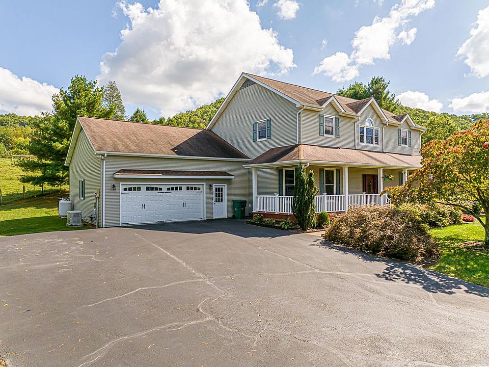 Welcome to Foxfire Estates! This beautiful 4-bedroom, 2.5-bath home sits on 1.22 acres with hillside views and the peaceful setting of an adjoining farm. The aesthetic black metal fenced backyard is a gardener's dream, complete with raised beds, fruit trees, and berry bushes. Outdoor living is at its finest with a covered front porch, a spacious covered back deck, and a stone patio—perfect for entertaining or relaxing. Inside, the main floor features hardwoods throughout and a roomy open floor plan that flows seamlessly from the front foyer through the formal dining room, great room, breakfast area, and kitchen, all opening out to the deck and lush yard. The huge kitchen features custom cabinetry, granite counters, a spacious center island and stainless appliances. Upstairs, the primary suite provides a private retreat, while 3 additional bedrooms share a well-designed hall bath with a large vanity and separate toilet/tub area. The oversized two-car garage offers storage rooms and a staircase to a full second level—ideal for extra storage or the potential to create additional living space. All this plus NEW WINDOWS, GENERATOR, Main level HVAC in 2020. This home in desirable Foxfire Estates combines comfort, functionality, and a serene setting just waiting for its next owner. All information deemed corrected and reliable, buyer or buyer's agent shall verify.