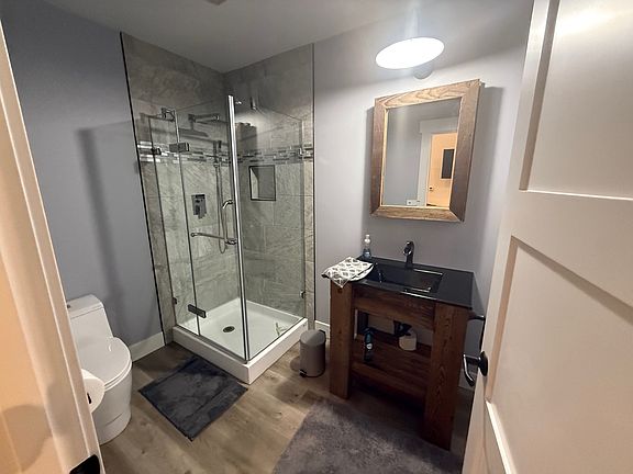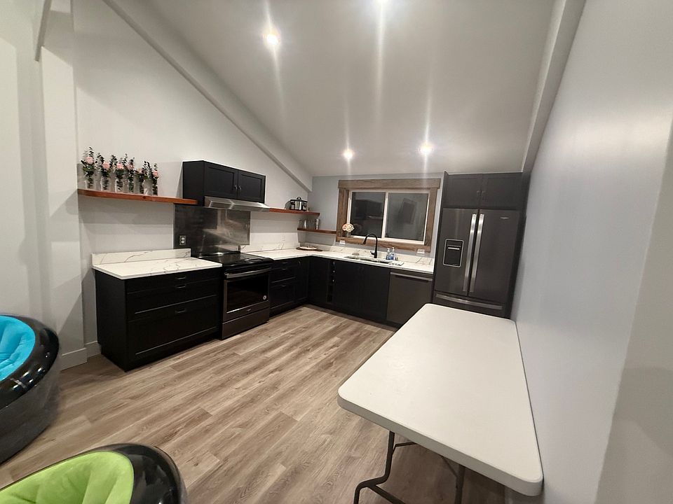 Brand new one bedroom apartment with loft above detached garage in quiet residential neighborhood. Beautiful high-end finishes, cathedral ceiling makes space feel open and inviting. Partially furnished, if desired. Washer/Dryer included. Separate entrance with parking for two cars. Large deck overlooking the protected greenbelt with active wildlife.