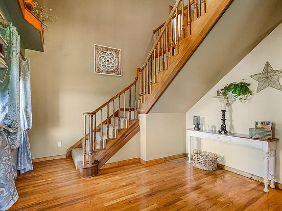 Beautiful and serene acreage with lots of space and still close to the city. With 7.68 acres spread out and enjoy horses, chickens, your stocked pond with a private dock, or whatever you like. The property also has a 36x29 shed for storage or horses, and a 42x39 outbuilding well built and newly added spray foam insulation and heating and cooling large enough for a workshop and/or additional garage space. Adorable home with a welcoming front porch and a back deck that faces the pond. Large main floor with a family room, eat in kitchen, living room with a wood burning heatilator fireplace, newly renovated half bath and office nook. Second floor features 4 bedrooms and two full bathrooms. The primary bathroom is newly remodeled and is stunning with heated floors. Basement features over 800 square feet of finished rec room, office area, or non conforming 5th bedroom and A LARGE MULTIPURPOSE ROOM FOR BASKETBALL, PICKLEBALL, VOLLEYBALL AND MORE! There is so much to this property you will have to see it for yourself. Award winning Basehor-Linwood School District. Welcome home!