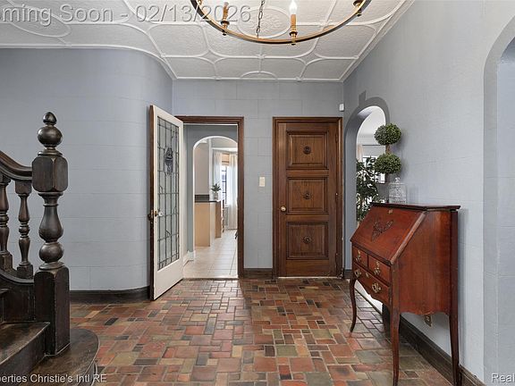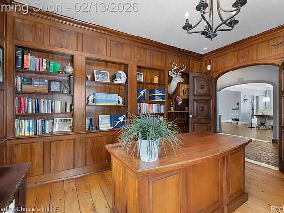 Rich in character, the home welcomes you with a foyer featuring beautiful original tile that sets the tone for the craftsmanship throughout. Arched doorways, leaded and stained glass windows, custom millwork, and beautifully refinished hardwood floors enhance the interior. A striking wood-paneled library with built-ins and a fireplace anchors the main level, while gracious living and dining rooms are filled with natural light and timeless detail. Three fireplaces—located in the living room, library, and primary bedroom—add warmth and architectural interest.