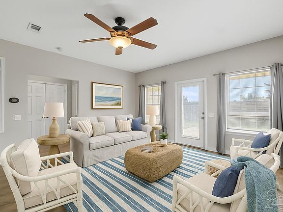 Welcome to your new home in a prime Gulf Breeze location—perfectly situated between both military bases and just minutes from beaches, shopping, top-rated schools, the zoo, and more! Located in a friendly neighborhood with sidewalks, a playground, and two peaceful lakes, this home offers the ideal balance of convenience and community. Step inside to find a bright, open floor plan with plenty of living space and storage. The inviting dining area features a beautiful bay window that fills the room with natural light, flowing into a modern kitchen with stainless steel appliances, ample counter space, a breakfast bar, and a pantry—perfect for everyday living or entertaining. Relax in the spacious living room, which opens directly to your fully privacy-fenced backyard, ideal for pets, play, or weekend gatherings. The first-floor primary suite offers comfort and convenience, complete with a large walk-in closet, dual vanities, and an oversized soaking tub. A main-level half bath adds extra ease for guests. Upstairs, you’ll find two large bedrooms with great closet space and a shared full bath. This beautifully maintained home offers comfort, location, and value—all at an affordable price! Don’t miss your chance to make it yours—schedule your showing today!