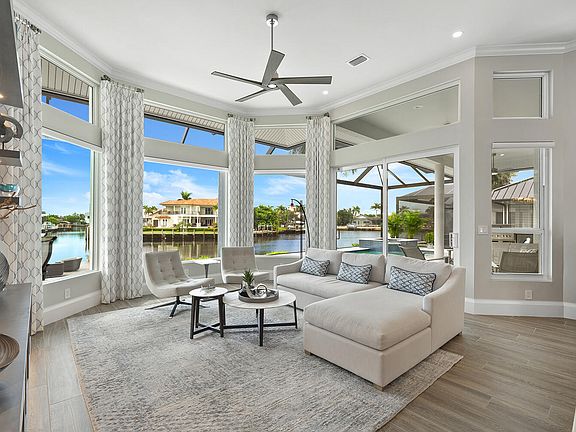 Simply put, this incredible home will wow you the moment you walk in the front doors! Enjoy spectacular wide & intersecting water views with breathtaking sunsets from the renovated pool & spa. The extensive interior and exterior renovations completed between 2022 and 2024 — totaling nearly $1 million dollars — are the finest, reflecting the highest standards in design and craftsmanship. (Roof 2017.) No expense was spared! The new impact glass and doors provide excellent sound insulation for peaceful enjoyment. Beautifully furnished with Robb & Stucky and Clive Daniel! With the raised ceilings and open floor plan, this house feels much larger than the square footage indicates. The windows and sliders were all reimagined to maximize the big water views and are complimented by electric shades & chic window treatments.