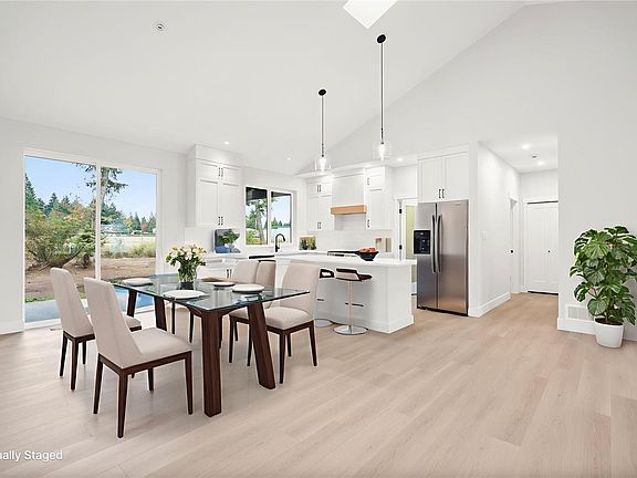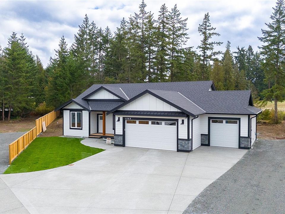 This brand new 1,604 sq ft rancher by John Schlitz Homes offers exceptional quality and modern design on a nearly half-acre level lot. With 3 bedrooms and 2 bathrooms, the home features 9-ft ceilings throughout vaulted ceilings in the great room, kitchen, and dining area. The chef’s kitchen is equipped with quartz counters, white cabinetry, a large island, and walk-in pantry. A rear covered patio with gas BBQ hookup provides seamless indoor-outdoor living, while the great room includes a striking fireplace and durable laminate flooring. The primary suite showcases a custom walk-in closet and ensuite with heated tile floors, tiled shower, and double vanity. Additional highlights include a triple garage with EV charger, RV/boat parking, Hardi Plank exterior with rock accents, covered front porch, and a 2.5-ton heat pump with air exchanger. Municipal water, septic system, and room for a shop complete this property just 10 minutes to downtown Nanaimo. Price plus GST. Measurements approx.