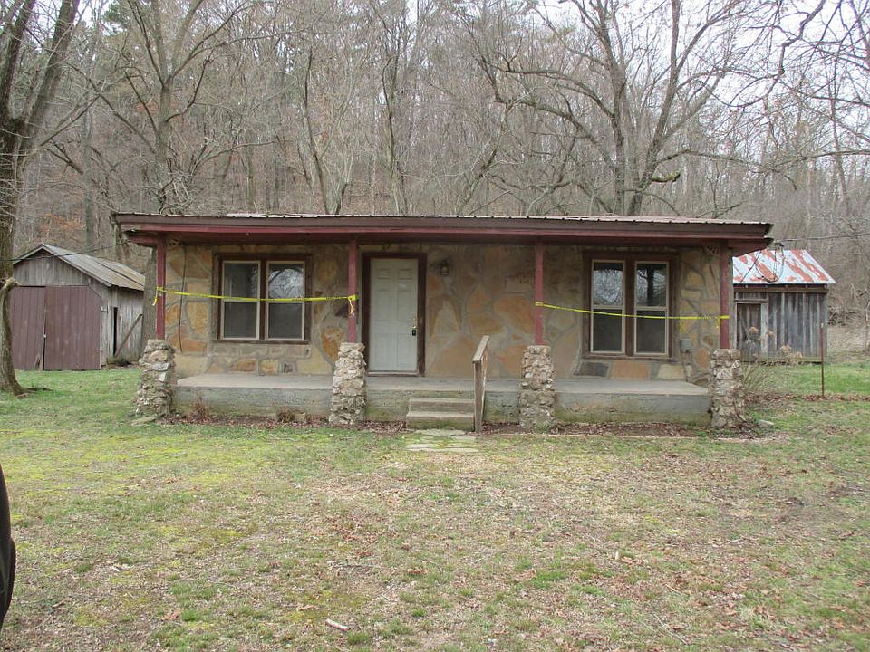 This stone exterior home features 2 bedrooms, 1 bath, kitchen, living room, front porch, and out buildings.